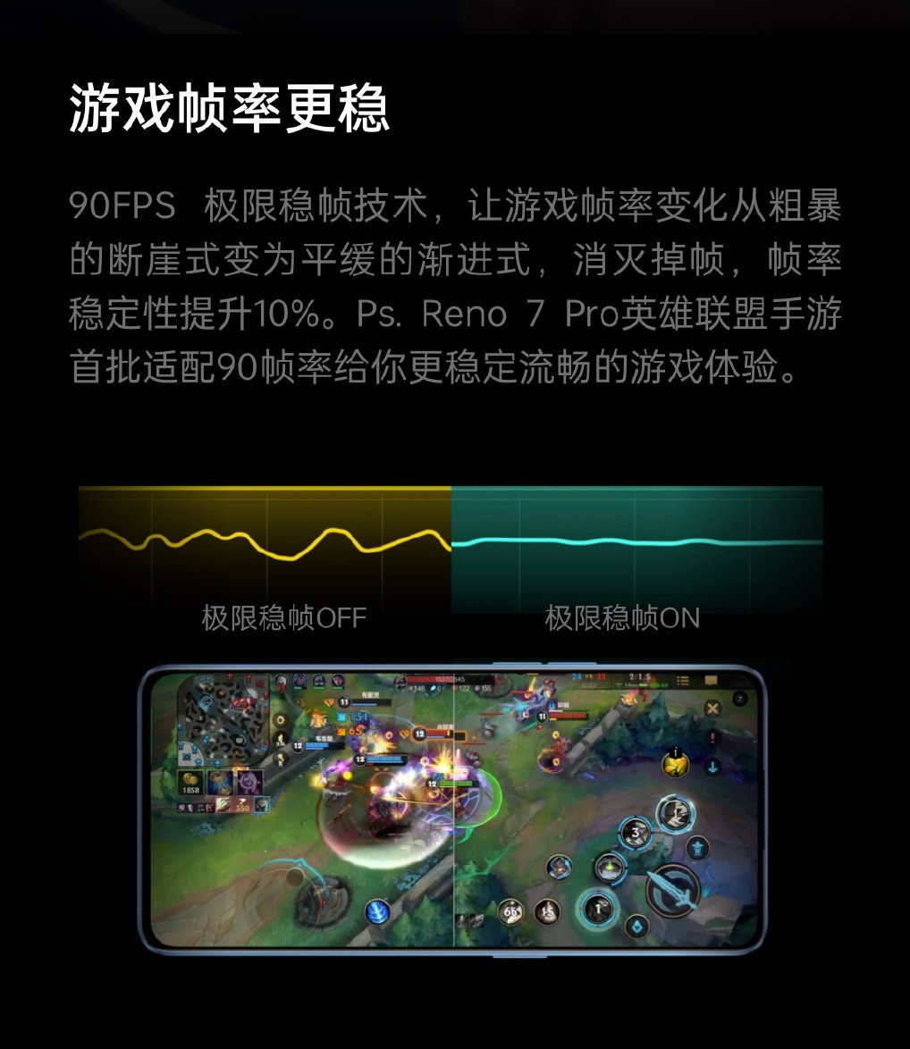 为了解决该问题,ColorOS 12带来全新90fps极限稳帧技术,在实时帧率检测、稳态温度预测、AI 调频技术加持下,让游戏的帧率变化从粗暴的断崖式变为平缓的渐进式,可以极大的提升画面流畅度。据悉,后续英雄联盟手游开放高帧率模式之后,Reno7 Pro也将成为首批适配90帧率的合作机型,最大程度让召唤师们获得稳定流畅的游戏体验。除了英雄联盟手游之外,ColorOS的90fps极限稳帧功能还支持原神等近10款主流头部大型游戏,并将持续增加可支持的游戏。未来,玩家将彻底告别高帧率模式下的帧率波动卡顿,尽享游戏丝滑体验。