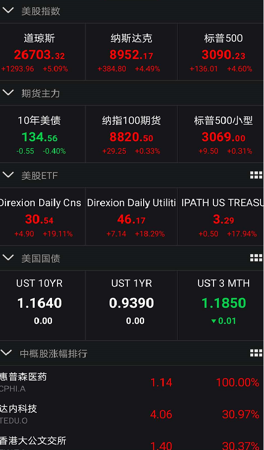 截至收盘,道指涨5.09%报26703.32点,标普500涨4.6%报3090.23点,纳指涨4.49%报8952.17点。美国大型科技股集体上涨,苹果涨9.31%;美国能源股普遍大涨,埃克森美孚涨4.78%;美国金融股集体收涨,摩根大通涨4.74%。特斯拉暴涨逾11%。