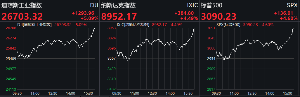 截至收盘,道指涨5.09%,报26703.32点;标普500涨4.6%,报3090.23点;纳指涨4.49%,报8952.17点。苹果涨9.3%,领涨道指。特斯拉涨逾11%,中概股京东涨逾12%。