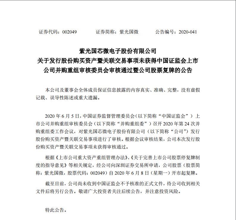 6月7日晚,紫光国微发布公告称,2020年6月5日,中国证监会上市公司并购重组审核委员会(以下简称“并购重组委”)召开2020年第24次并购重组委工作会议,对紫光国芯微电子股份有限公司(以下简称“公司”)发行股份购买资产暨关联交易事项进行了审核。根据会议审核结果,公司本次发行股份购买资产暨关联交易事项未获得审核通过。