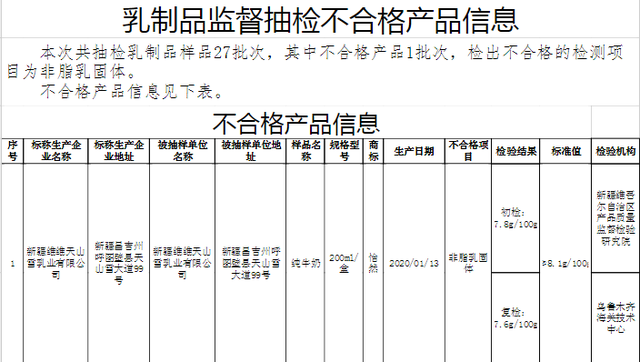 本次抽查发现,非脂乳固体不符合食品安全国家标准规定样品1批次,为维维天山雪乳业生产的纯牛奶。该牛奶规格型号为200ml/盒,商标为怡然,生产日期为2020年1月13日,不合格的项目非脂乳固体初检含量为7.8g/100g,复检结果为7.6g/100g,初检机构为新疆维吾尔自治区产品质量监督检验研究院,复检机构为乌鲁木齐海关技术中心。