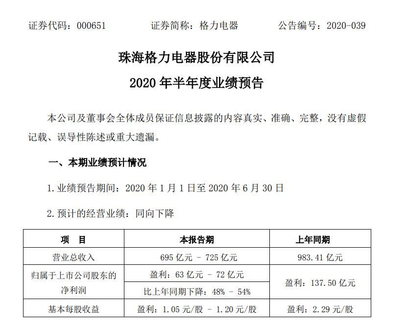 14日晚,格力电器发布2020年半年度业绩预告,预计上半年营收695亿元-725亿元,归属于上市公司股东的净利润为63亿-72亿元,同比下降48%-54%。