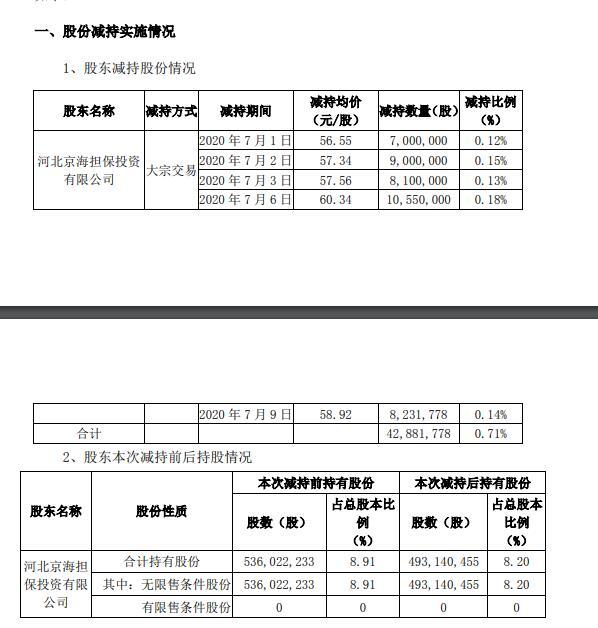 7月9日晚,格力电器发布公告称,截至2020年7月9日,京海担保累计通过大宗交易的方式减持公司股份4288.18万股,占公司总股本的0.71%,本次减持计划已实施完毕。
