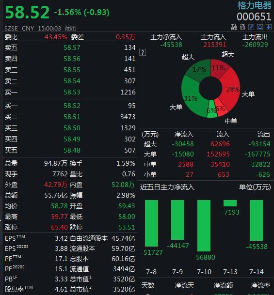 据Wind数据显示,截至7月14日收盘,格力电器股价下跌1.56%报58.52元/股,总市值3520亿元。