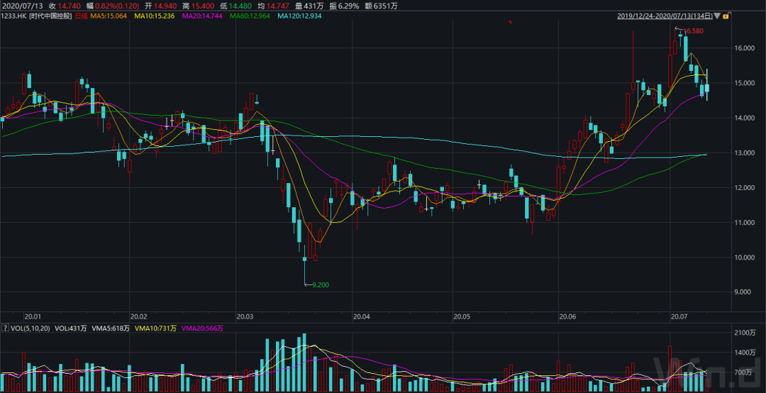 截至2020年7月13日,时代中国报收于14.74港元/股,较近期反弹新高下挫11.10%,市值蒸发约30亿港元。