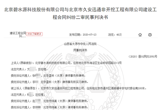 法院一审裁定,碧水源现需付清欠款106.3万元。对于久安讯通曾分三次向碧水源的子公司久安建设借款190万事宜,山西省太原市中级人民法院认为属于案外经济纠纷,建议通过另案主张的方式解决纠纷更妥。