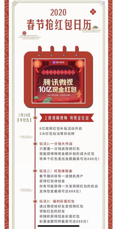 騰訊微視也宣布,投入10億現金紅包,從小年開始一直發到元宵節。春節期間,微視在微信紅包裡新增“視頻紅包”玩法,用戶可以直接在微信內為親朋好友發視頻紅包了,目前,該功能已上線。