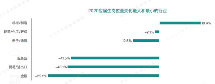 报告显示,2020年春招季相当数量的企业放慢了招聘步伐。其中,岗位收缩程度最大的是金融行业,特别是互联网金融相关领域。此外,受国外疫情爆发影响,贸易/进出口行业受到二次冲击,纺织、鞋履、小商品等领域外贸订单数下降,应届生岗位数量也有所收缩;能够吸纳大量应届生就业的服务业和贸易行业受到冲击。
