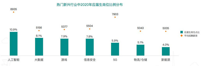与此同时,2020年春招季,战略新兴行业中面向应届生的岗位规模较去年同期普遍有1-5个百分点的提高,应届生岗位占比也高于全行业均值。