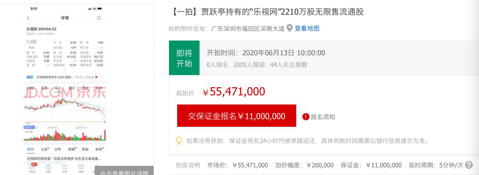 记者从某拍卖平台获悉,贾跃亭持有的乐视网(现乐视退)2210万股无限售流通股将在6月13日在该平台上拍卖,起拍价为5547.1万元。