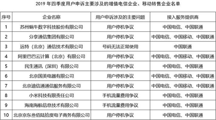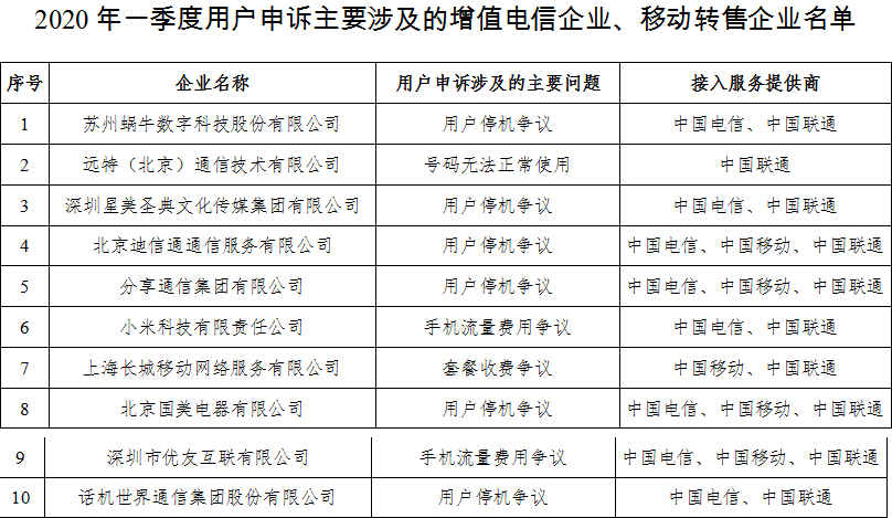 另外,工信部此前发布的2019年四季度的该名单中的10家企业中,此次一季度榜单有6家再度名列其中。分别是:苏州蜗牛数字科技股份有限公司、分享通信集团有限公司、远特(北京)通信技术有限公司、北京迪信通通信服务有限公司、小米科技有限责任公司、北京国美电器有限公司。