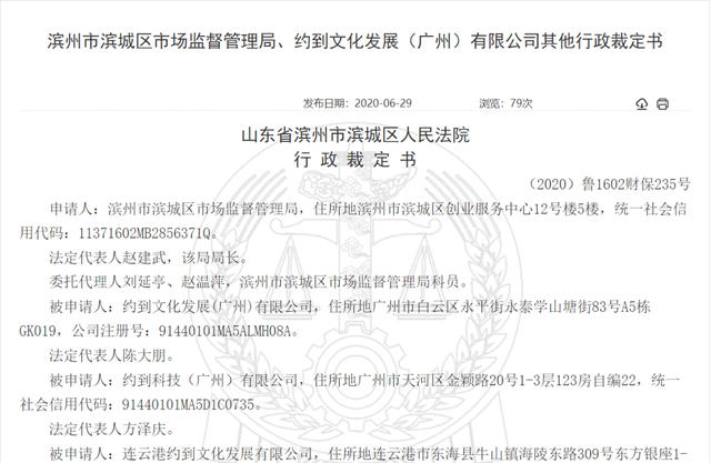 山东省滨州市滨城区人民法院裁定,冻结约到文化发展(广州)有限公司存款35637.16元;冻结连云港约到文化发展有限公司存款4266214.20元;冻结广州靓肌生物科技有限公司存款9187.70元;冻结约到科技(广州)有限公司存款1687210.71元,金额共计5998249.77元。