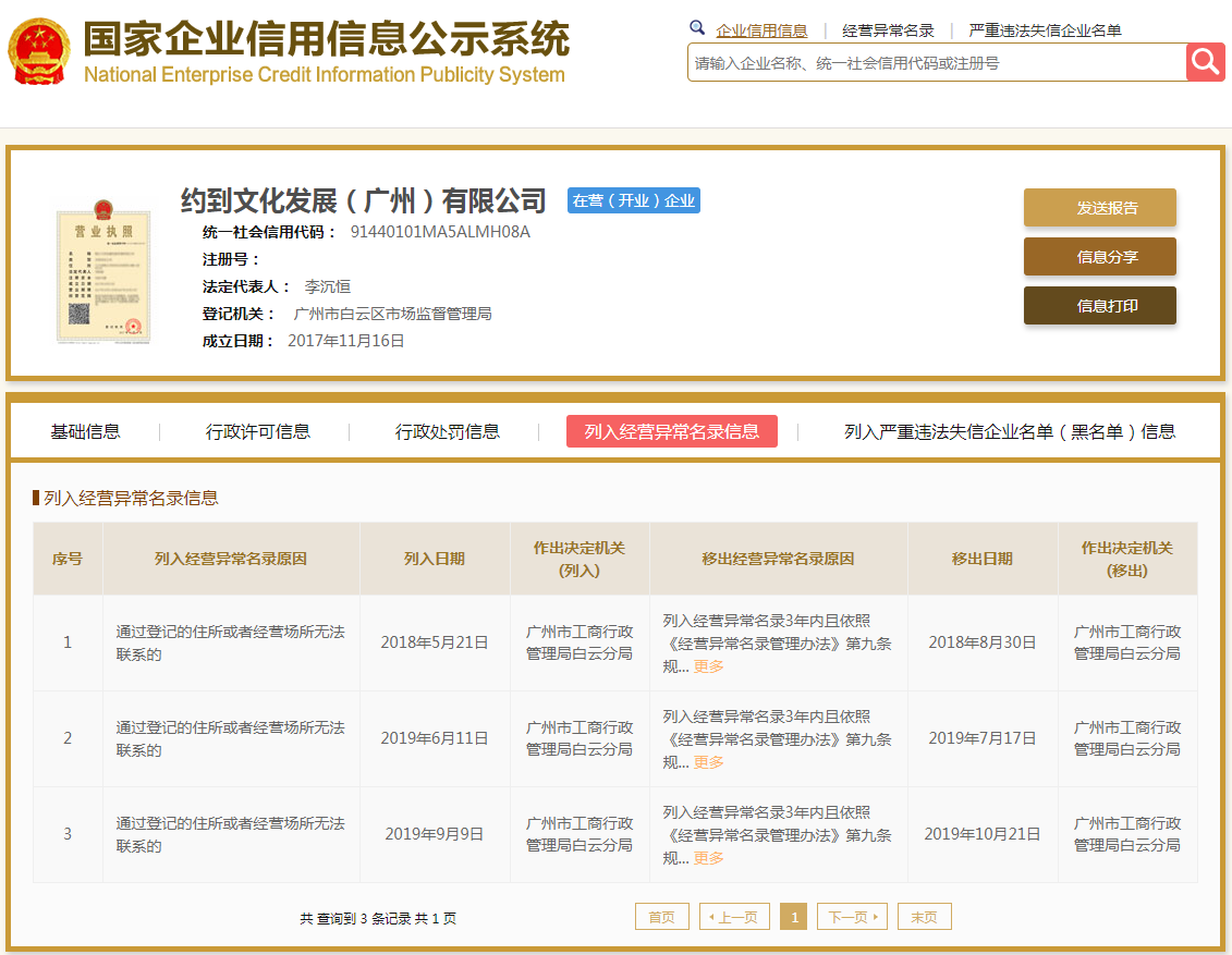 约到文化发展(广州)有限公司成立于2017年11月,注册资本 5000万元,李沉恒任公司法定代表人、执行董事、总经理,并百分百控股。另外,该公司3次被广州市工商行政管理局白云分局列入经营异常,均因通过登记的住所或者经营场所无法联系。