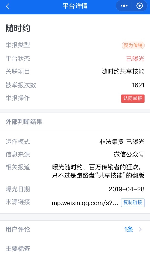 记者从灵鲲金融风险查询举报中心发型,“随时约”疑为传销,运作模式为非法集资目前已曝光,被举报次数1621次,关联项目为“随时约共享技能”。