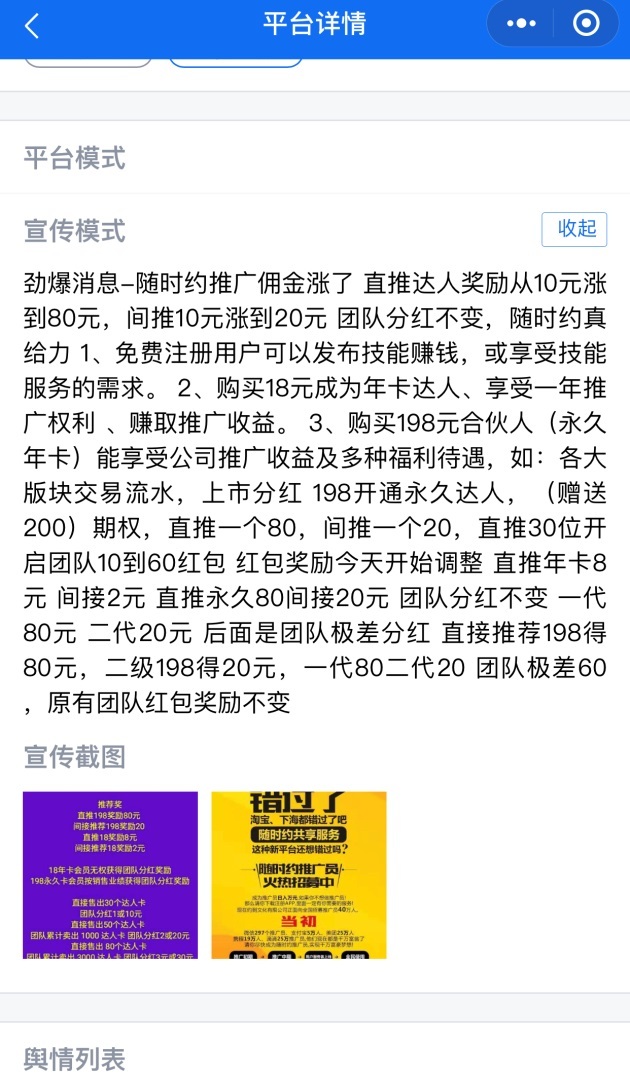据举报中心披露,在随时约最开始招募合伙人的时候,用户只要缴纳押金18元或者198元就可以到该平台上体验服务,18元成为会员达人,无权获得团队分红奖励,可参与推广,有效期1年。198元成为永久会员达人,按销售业绩获得团队分红奖励。