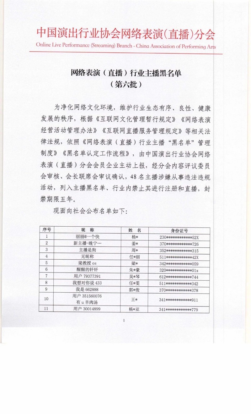 中国演出行业协会网络表演(直播)分会微信号9日公布第六批主播黑名单。其中,48名主播涉嫌从事违法违规活动,列入主播黑名单、行业内禁止其进行注册和直播,封禁期限5年。