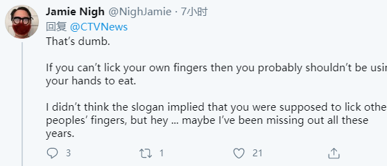 “那太蠢了。如果你不能舔自己的手指,那么你可能就不应该用手吃饭。我不认为这个口号暗示你应该舔别人的手指,嘿……也许这些年来我一直误解了?”