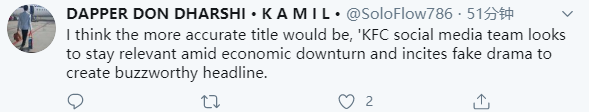 “我认为更准确的标题应该是,肯德基社交媒体团队希望在经济低迷时期保持相关性,并煽动虚假事件来制造出有价值的头条新闻。”