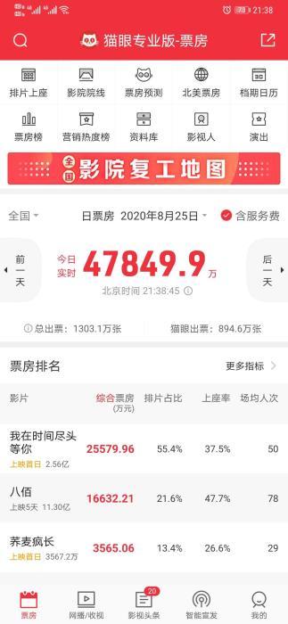 截至8月25日21:38,七夕节单日票房已达4.78亿。来源:猫眼专业版。