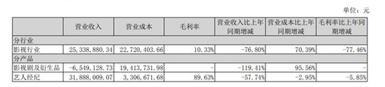 半年报显示,2020年上半年欢瑞世纪来自影视剧及衍生品的营业收入为-654.9万元,同比减少119.41%,艺人经纪业务营业收入为3188.8万元,同比减少57.74%,艺人经纪的毛利率对比去年同期下降5.85个百分点,为89.63%。