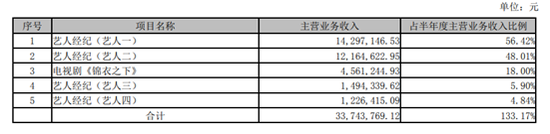 对比2019年和2020年半年报主营业务收入前五名的情况,艺人一(推测为杨紫)的“吸金能力”有所下滑,2019年上半年为3518.7万元,占半年营收的32.22%,2020年为1429.7万元,占比升至56.42%。
