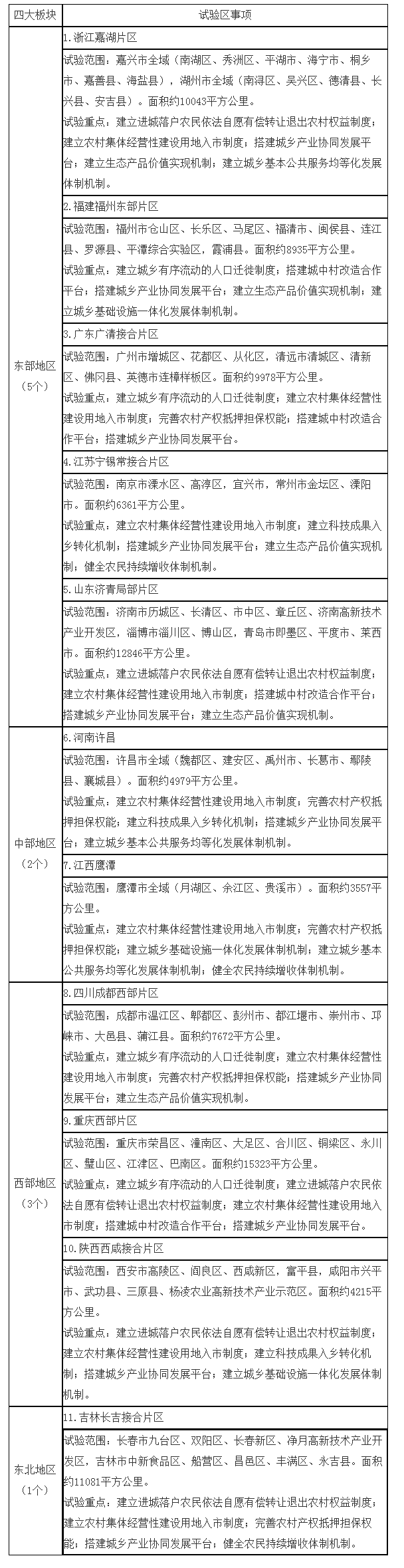 12月27日,国家发改委等十八部门联合印发《国家城乡融合发展试验区改革方案》。并公布11个国家城乡融合发展试验区名单,分别是:浙江嘉湖片区、福建福州东部片区、广东广清接合片区、江苏宁锡常接合片区、山东济青局部片区、河南许昌、江西鹰潭、四川成都西部片区、重庆西部片区、陕西西咸接合片区、吉林长吉接合片区。