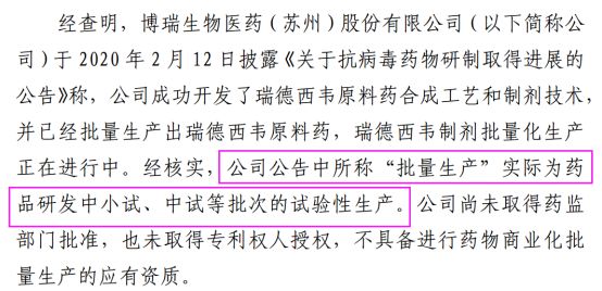 上交所认为,博瑞医药未能明确区分相关药品试验性生产与商业化生产,所披露的“批量生产”实际属于药品研发阶段,而非已完成审批并开始正式生产销售瑞德西韦原料药和制剂。同时,王征野在接受媒体采访时的表述,进一步混淆了试验性生产与商业化生产,相关表述不清晰、不准确。
