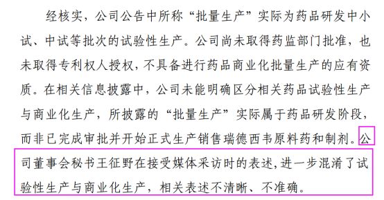 上交所指出,2月12日,王征野在接受媒体采访时称,公司研发生产的瑞德西韦原料药和制剂可以批量生产。同日,公司发布公告称,成功开发了瑞德西韦原料药合成工艺和制剂技术,并已经批量生产出瑞德西韦原料药,瑞德西韦制剂批量化生产正在进行中。