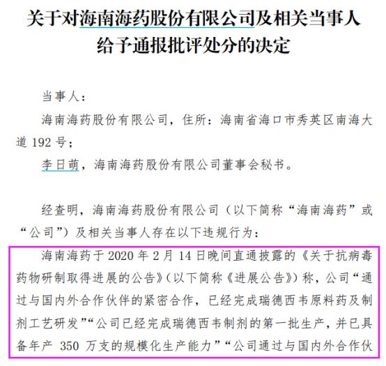 虽然在这次蹭热点中,海南海药仅仅收获一个涨停,但是公司董秘却因此被给予通报批评处分的决定。