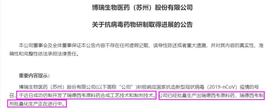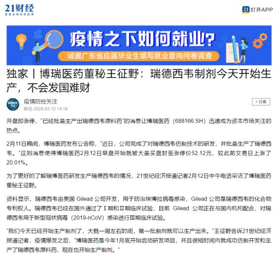 博瑞医药董秘王征野当时还对21世纪经济报道的记者表示,公司在十几天内就仿制瑞德西韦成功。