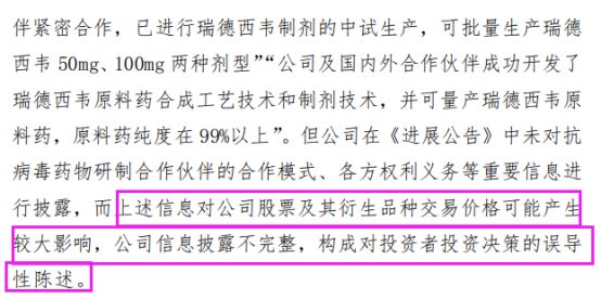 深交所认为,公司在公告中未对抗病毒药物研制合作伙伴的合作模式、各方权利义务等重要信息进行披露,而上述信息对公司股票及其衍生品种交易价格可能产生较大影响,公司信息披露不完整,构成对投资者投资决策的误导性陈述。