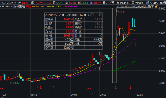 博瑞医药也因此受到了资本市场的强烈追捧,公司股价在2月12日、13日分别一字涨停(科创板涨跌幅为20%)。短短3个交易日,公司股价上涨了58.65%,总市值暴涨了118亿元。