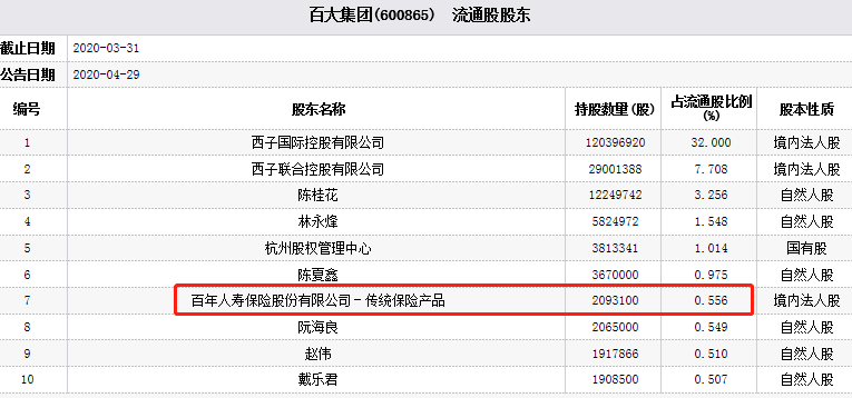 百大集团2020年一季报显示,百年人寿保险股份有限公司旗下的一传统保险产品位列该股前十大流通股东中,持有209.31万股,占百大集团流通股比例的0.556%。