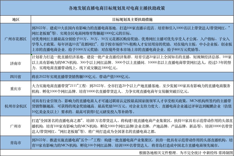 例如青岛市提出,到2022年,推进实施直播电商“五个一”工程,包括培训1000名带货达人等,将青岛打造成中国北方直播电商领先城市。广州市提出打造“全国著名的直播电商之都”,培训1万名带货达人的口号。