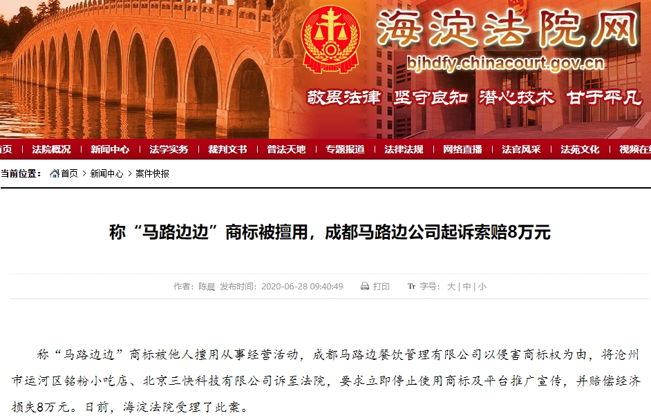 据北京市海淀区人民法院网站28日消息,称“马路边边”商标被他人擅用从事经营活动,成都马路边餐饮管理有限公司以侵害商标权为由,将沧州市运河区铭粉小吃店、北京三快科技有限公司诉至法院,要求立即停止使用商标及平台推广宣传,并赔偿经济损失8万元。