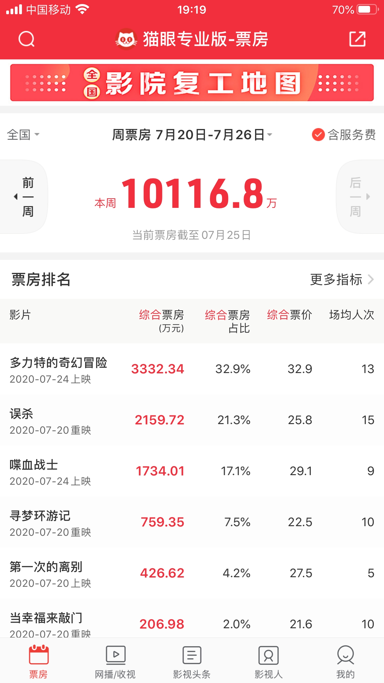 据猫眼专业版APP提供数据,截至7月26日18时,复工后首周全国累计票房破亿。
