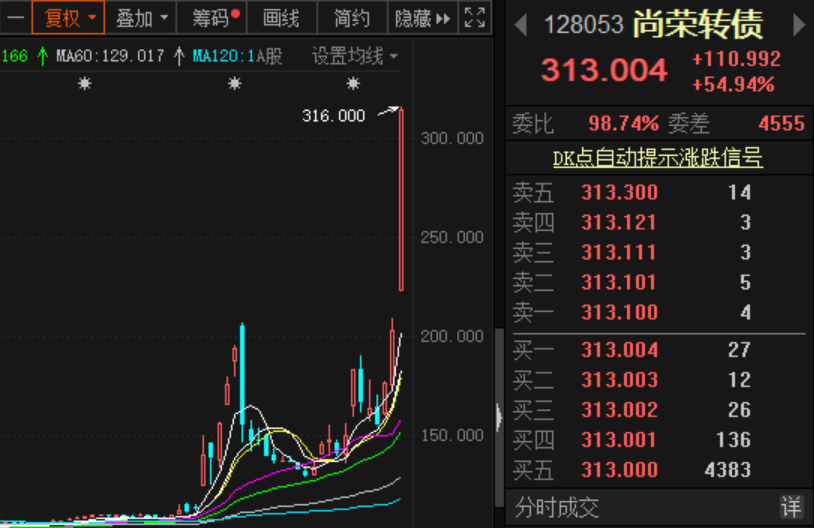 尚荣医疗昨日股价一字涨停,这也意味着公司股价还可能会继续上涨,买不到正股的投资者,就去买没有涨跌幅限制的可转债,推动可转债大幅上涨,按照昨天这种涨幅,尚荣医疗还要四个涨停,才能赶上可转债的进度。