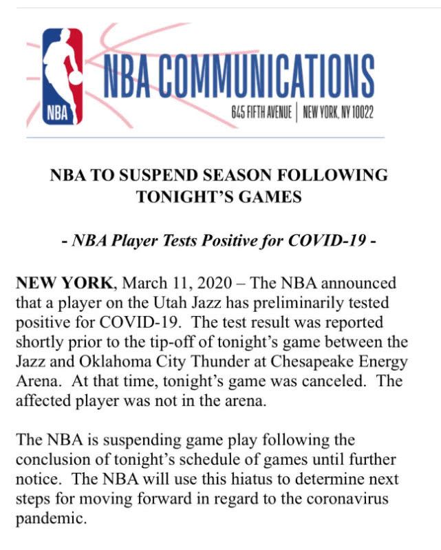 据NBA官方确认,2019-2020赛季暂停。目前爵士中锋戈贝尔已被确诊为新冠肺炎。