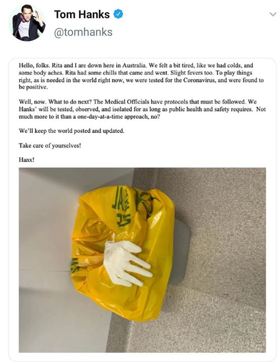 汉克斯发表独家声明:“大家好,我和丽塔来澳大利亚了。我们感到有点累,就像得了感冒和一些身体疼痛。丽塔有些反反复复的寒意,也有些轻微发烧。为了让一切步入正轨,这是当今世界所需要的,我们已经测试了冠状病毒,并被证明是阳性的。