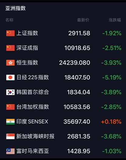 但亚洲市场的投资者没有获得他们预期中的“礼包”。截止发稿,亚洲主要股票指数均出现大幅下跌:香港恒生指数下跌3.93%,日经225指数下跌5.19%,韩国综合指数下跌3.89%,新加坡海峡时报指数下跌3.86%。