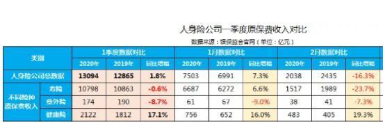 银保监会数据显示,2020年1季度保险业原保费收入16695亿元,同比增长4.2%。