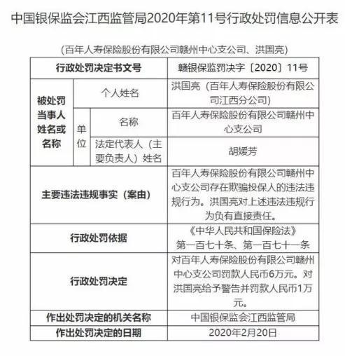 3月1日,江西银保监局公布处罚信息:百年人寿赣州中心支公司存在欺骗投保人的违法违规行为,被罚款人民币6万元,对直接责任人洪国亮给予警告并罚款1万元。