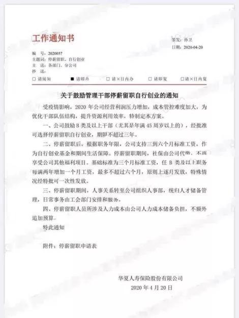 4月20日,华夏一纸内部通知流出:受疫情影响,因2020年经营利润压力增大,为优化干部结构,提升资源利用效率,鼓励B类以上管理干部(特别是45岁)以上的,可选择停薪留职进行创业,期限不超过三年。根据职务年限,公司支持三到六个月标准工资,作为自行创业资金和基本生活保障。