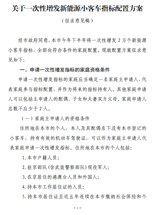 今天,北京市发布《关于一次性增发新能源小客车指标配置方案(征求意见稿)》。根据意见稿,拟在今年8月,一次性增发2万个新能源小客车指标,全部向“无车家庭”配置。