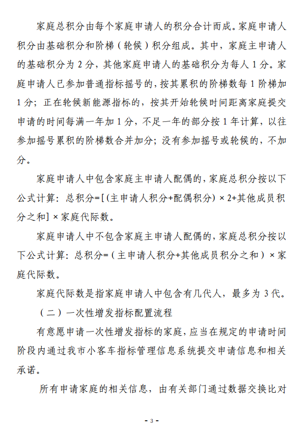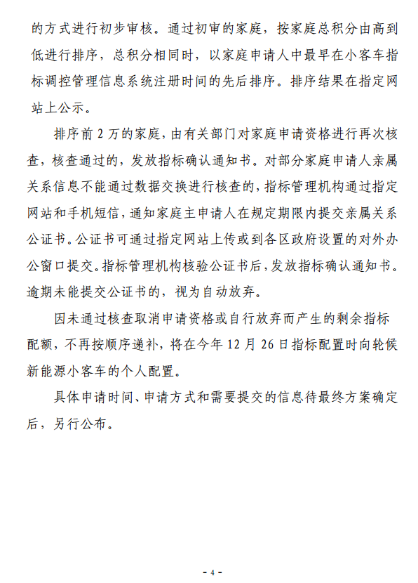 具体配置办法总体上与政策优化方案中关于按家庭积分排序配置新能源小客车指标的方案保持一致。根据征求意见修改完善后,将尽快启动实施,让2万个“无车家庭”尽早受益。