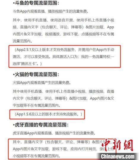比如详情页注明,斗鱼App内观看直播、播放视频产生的流量免费。但使用手机直播、使用语音开黑、使用手机上传直播小视频、直播内文字(包含聊天、评论、弹幕等)等不在专属流量范围内。此外,App2.5.1及以上版本才支持免流服务,并需用户在App内手动激活,才可以享受免流。