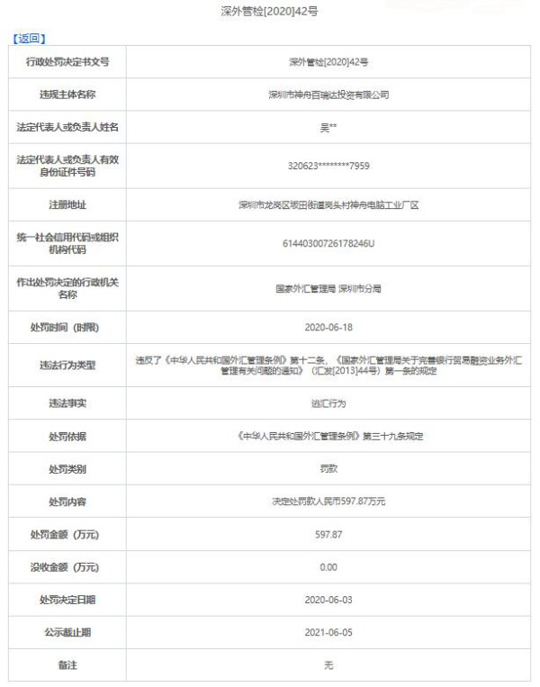 国家外汇管理局深圳市分局依据《中华人民共和国外汇管理条例》第三十九条规定,对深圳神舟百瑞达罚款人民币597.87万元。