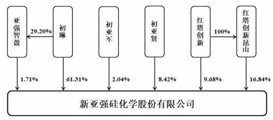 招股书显示,初亚军、初琳、初亚贤直接和间接合计持有新亚强72.27%的股份,为公司的实际控制人,其中,初琳直接持有公司61.31%的股份,作为执行事务合伙人通过亚强智盈间接持有公司0.50%的股份,直接和间接合计持有公司61.81%的股份,为公司的控股股东;初亚贤直接持有公司8.42%的股份;初亚军直接持有公司2.04%的股份。初亚军与初琳系父女关系,初亚军与初亚贤系兄弟关系。