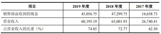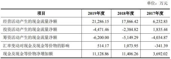 2016年至2019年,公司经营活动产生的现金流量净额为2236.31万元、6232.83万元、17,866.42万元和21,286.15万元。同期公司销售商品收到的现金分别为12,236.13万元、16,658.73万元、47,299.75万元和45,056.75万元,占营收比例分别为63.74%、62.30%、72.77%和74.85%。