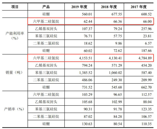 2016年至2019年,六甲基二硅氮烷的产能利用率分别为73.58%、66.00%、66.36%和62.44%。销量分别为5194.30吨、4784.89吨、4130.41吨和4153.51吨。